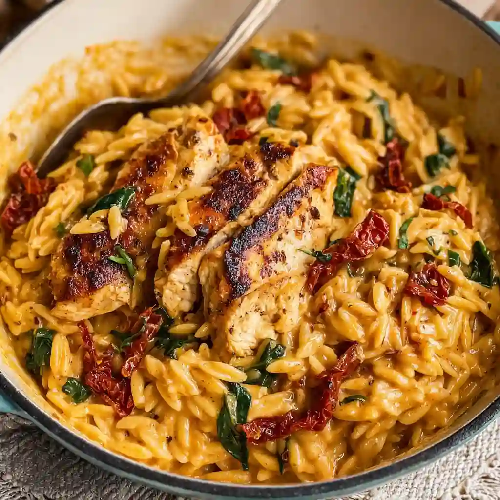 This Creamy Sun-Dried Tomato Chicken Orzo is the ultimate comfort food that’s quick enough for busy weeknights yet elegant enough for entertaining. Tender chicken, tangy sun-dried tomatoes, fresh spinach, and parmesan come together in a garlicky cream sauce that clings perfectly to orzo pasta. It’s a one-pan dinner that’s hearty, flavorful, and ready in just 30 minutes.