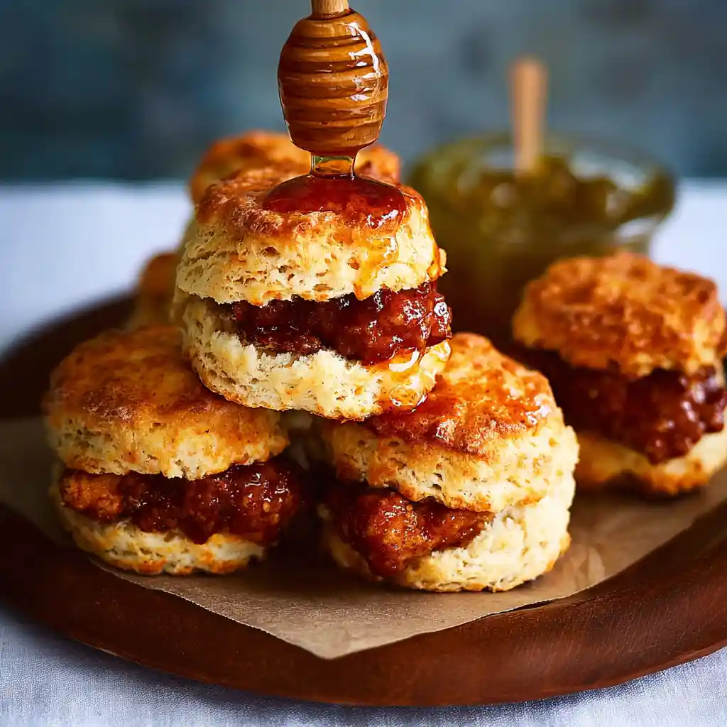 - Assemble: Slice biscuits in half, add fried chicken, and drizzle with hot honey.