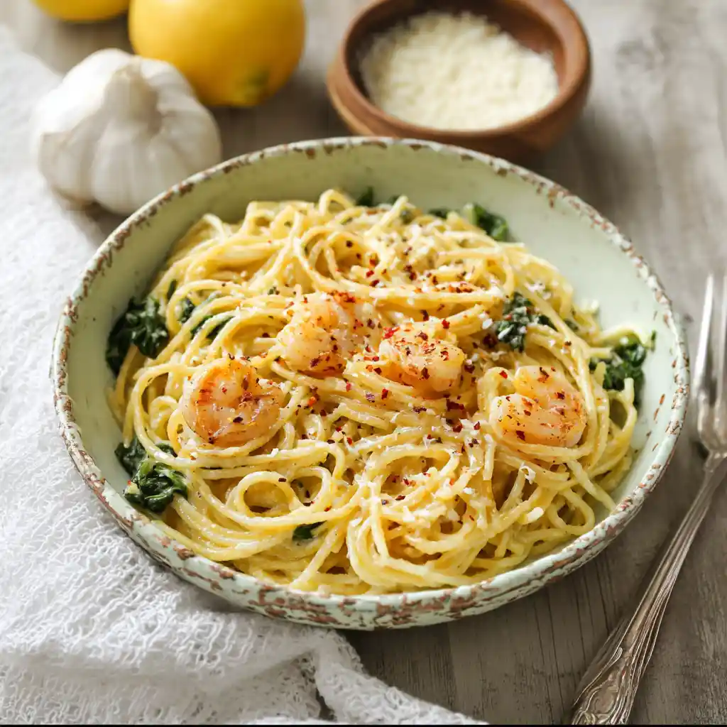 This Lemon Garlic Shrimp Pasta with Spinach is the perfect mix of light, fresh, and satisfying. Juicy shrimp are sautéed in garlic, olive oil, and lemon juice, then tossed with pasta and baby spinach for a wholesome yet indulgent dinner.