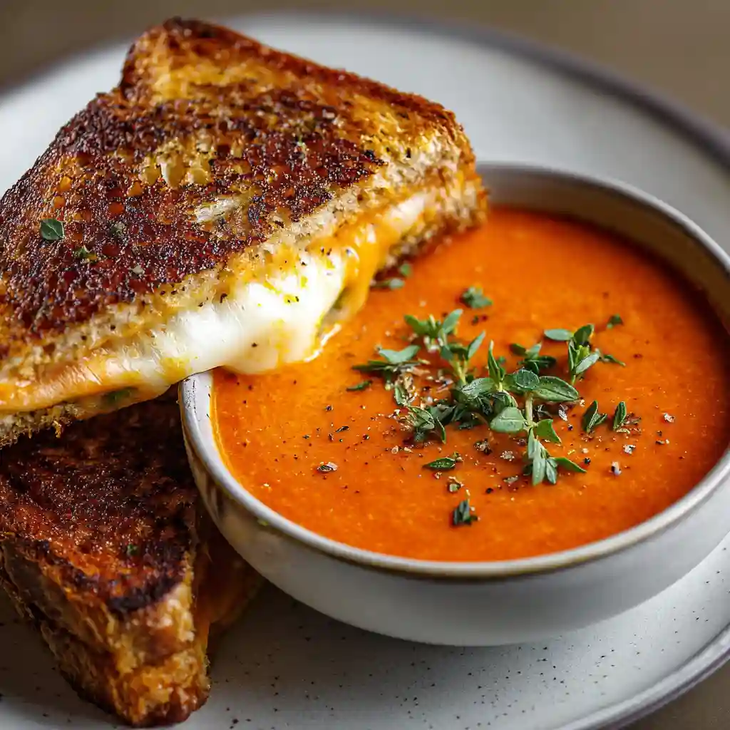 A cozy, balanced meal combining creamy roasted tomato soup and golden grilled cheese.