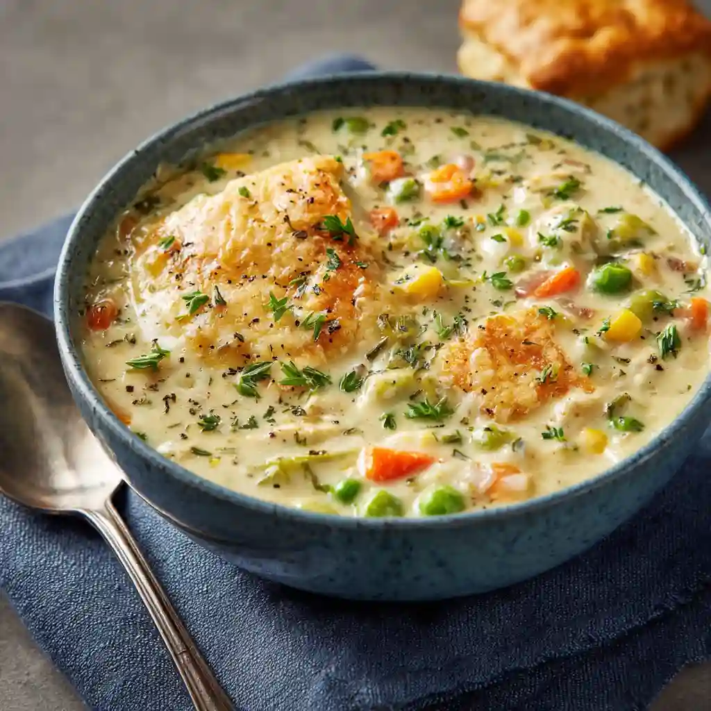 A creamy, vegetable-focused soup that gives pot pie flavors in a lighter form.